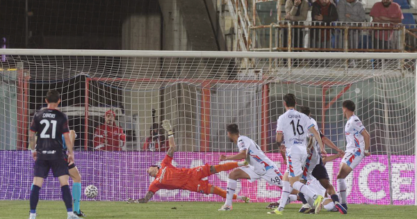 Catania (4-2-3-1) Dini 6; Raimo 5,5 (dal 12’ s.t. Donnarumma 6), Ierardi 5, Miceli 4,5, Celli 4,5; Di Tacchio 5,5 (dal 12’ s.t. Corbari 6), Quaini 5.5; D’Ausilio 6 (dal 20’ s.t. Forte 6,5), Cicerelli 5 (dal 20’ s.t. Caturano 5), Bruzzaniti 4,5; Lunetta 5,5 (dal 36’ s.t. Di Noia s.v.).